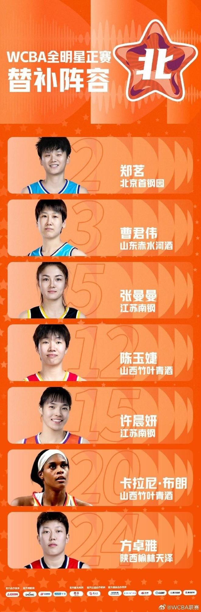 北区替补:郑茗(北京)、曹君伟(山东)、张曼曼(江苏)、陈玉婕(山西)、许晨妍(江苏)、卡拉尼-布朗(山西)、方卓雅(陕西)